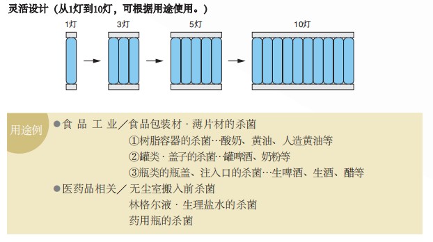 可在短時間內(nèi)進行包裝材料或食品等表面殺菌的強力紫外線殺菌裝置。與以往的硬質(zhì)玻璃制低輸出殺菌燈相比,具有數(shù)十倍(與本公司相比)的殺菌能力,黑霉菌和耐性強的細菌也可在數(shù)十秒內(nèi)消滅。